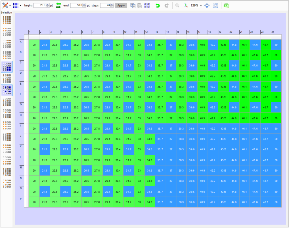 The MANTIS software provides you with several options to select multiple wells using different patterns, to speed up the dispense design process. This can be especially useful when using plates with large numbers of wells. There are 15 different patterns available in the MANTIS software. A blue box surrounding the icon indicates that a selection pattern is active, while inactive patterns do not have a blue box. You may use more than one pattern at a time, according to your needs. When you have applied a selection pattern, you can easily define the volume for the selected well(s) by either typing a volume or by using the available dispense designs.