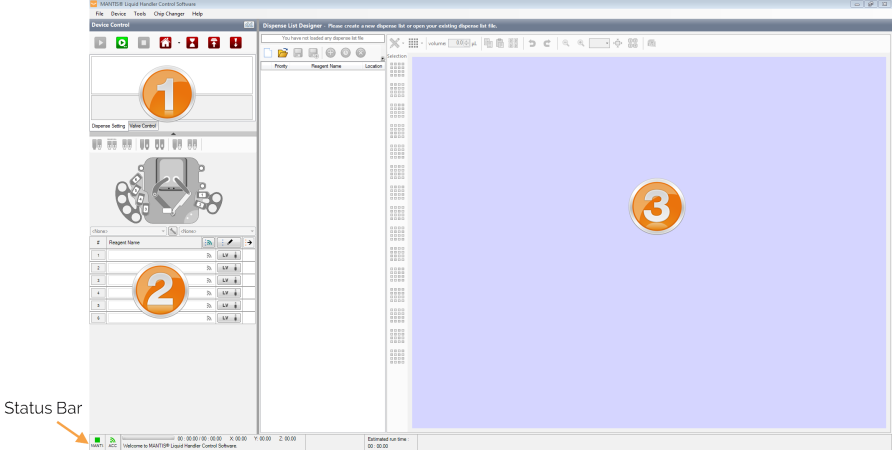 Section 1 is the Device Control panel. This is where you execute commands on the MANTIS hardware using the buttons at the top. Here you can also view information about your current plate definition, the total volume per well, and the number of plates to be dispensed. For more information, see Device Control Panel.