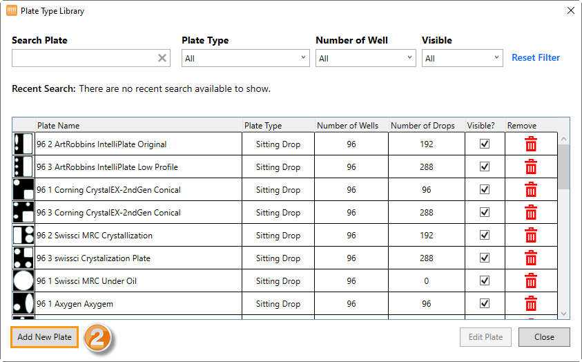 Your plates must be defined on the NT8 Control Software before they can be used in an experiment. NT8 comes preloaded with the most common plate types in the Plate Type Library, but you can create new definitions for other types of plates that you want to use. Plate definitions represent actual information of the plate, such as the number of drops, reservoir wells, plate height, and column pitch. All of this information is important to ensure dispense accuracy and precision.