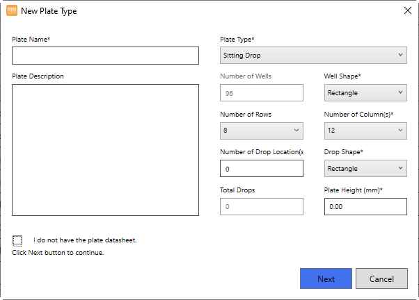 If you have the datasheet of the plate, simply copy the information to the respective fields on the New Plate Type wizard.