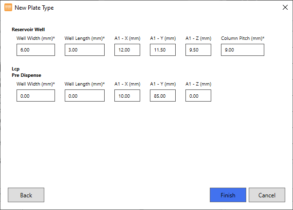 If you are creating a new LCP plate, you will not see the Drop Well section. Instead, you will need to define the dimensions for the LCP Pre-dispense process. This ensures the LCP syringe to perform pre-dispense cycles outside the plate wells, also prevents inaccurate dispense volume.