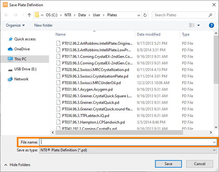 Type a descriptive name for your new plate in the Save Plate Definition dialog box to save it as a .PD file. For easier identification, the filename should be the same as the defined name in the Plate Name field in step 2.