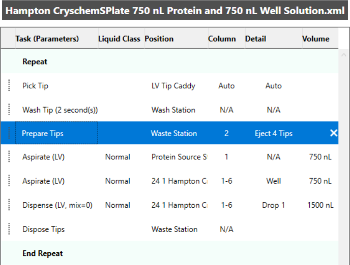 The Sitting Drop setup template with 24-well plate types is pre-installed with your software. You may use it if you plan to combine up to 750 nL protein and 750 nL well solution for a 1500 nL dispense. You can modify these volumes by double-clicking the item on the task list. The Hampton Cryschem Plate is the default plate for the Sitting Drop template.