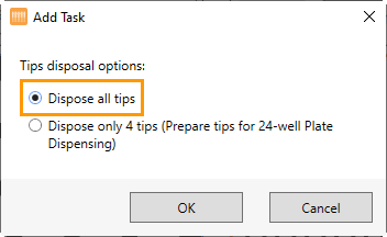 On your Task List panel, the Prepare Tips task is automatically added before protein aspiration. This task discards 4 tips before aspirating the protein to make it compatible with the 24-well plate dispense.