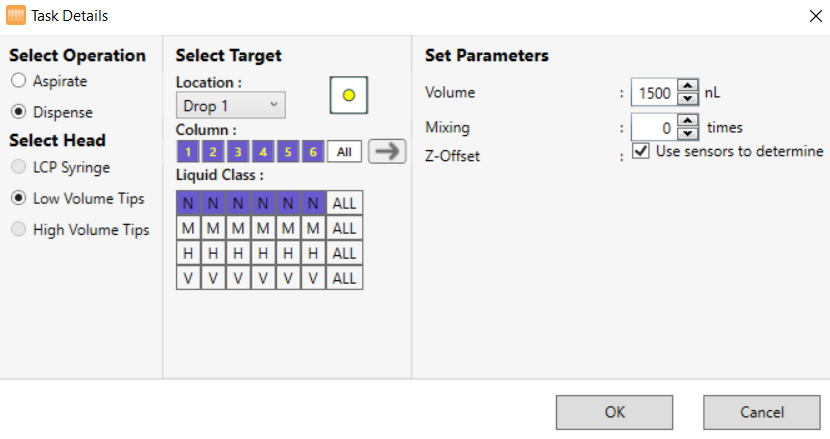 Task Details Window for Protein and Well Solution Dispensing