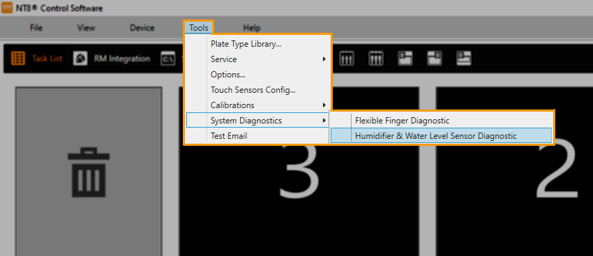 Open NT8 software and go to Tools > System Diagnostics > Humidifier & Water Level Sensor Diagnostics.