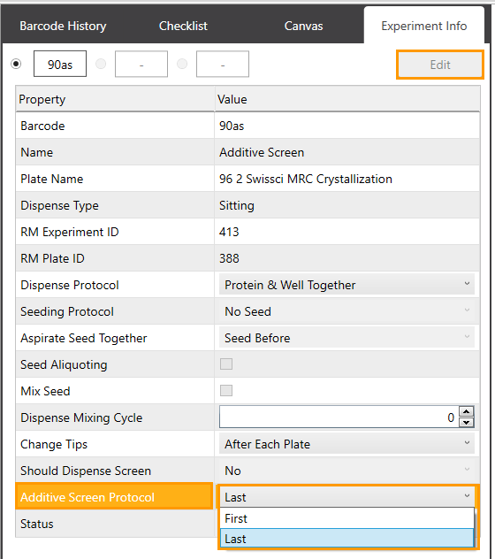 Choose a plate station to dispense the additive screen and enter the experiment barcode number (the following example uses Plate Station 1) or scan the barcode with a barcode scanner (if it is available). After the barcode is validated, select a protein source block in the Select Protein Type dialog box. Then, click Continue in the Warning dialog box.