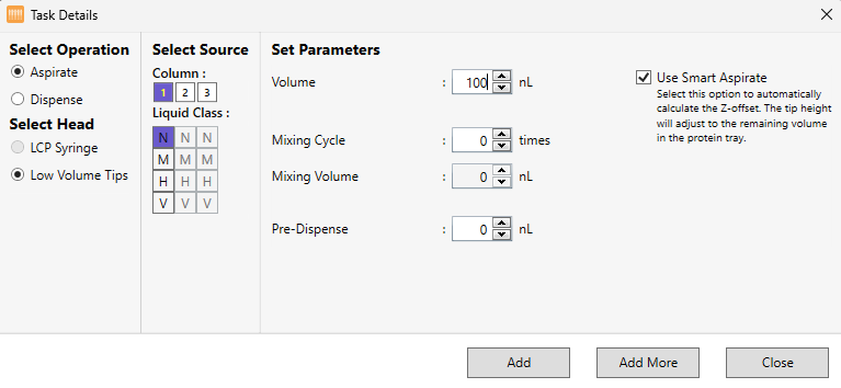 OPTIONAL: You may opt for Custom Aspirate to determine the tip height during an aspiration task. However, we recommend that you use Smart Aspirate so that the tip height will automatically adjust to the remaining volume in the protein tray. Smart Aspirate is enabled by default.