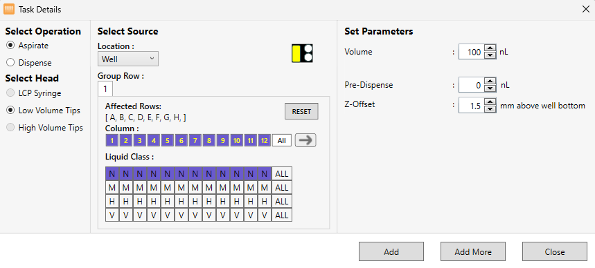 Under Select Operation, select Aspirate. The Low Volume Tips under Select Head is automatically selected.