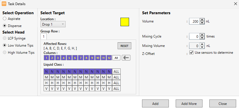 Verify that Dispense is selected under Select Operation. The Low Volume Tips under Select Head is automatically selected.
