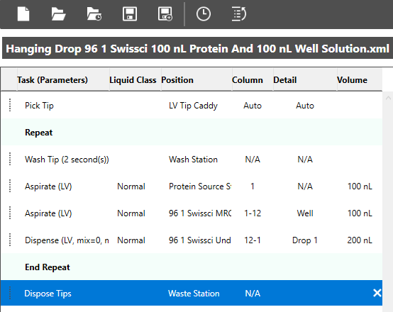 Open the Sample folder and select the Hanging Drop MRC2 100 nL Protein And 100 nL Well Solution task list.