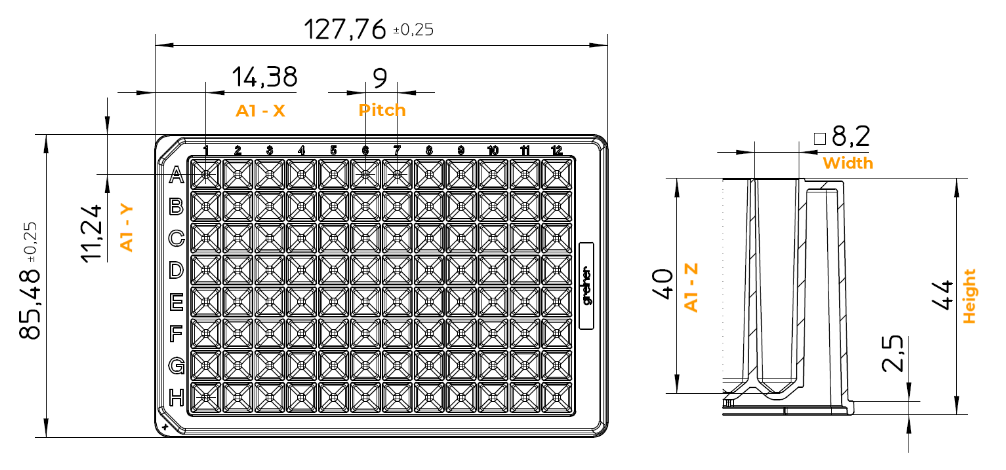 A1 - X (mm) - The X offset position values of the A1 well of your plate. The example value is 14.50 mm.