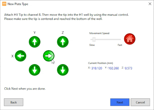 Repeat step 8 and move the HV Tip to the H12 of the well to find the plate depth of the back row. Please make sure it is centered and reaches the bottom of the well. Click Next when you are done.