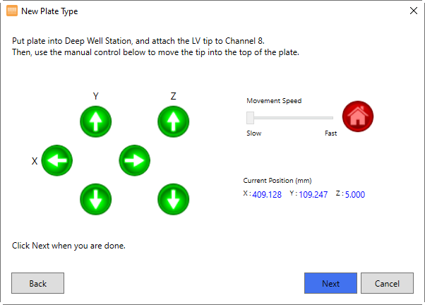 To find the plate height, use the manual control buttons to move the LV tip to any area on the top of the plate. Click Next when you are done.