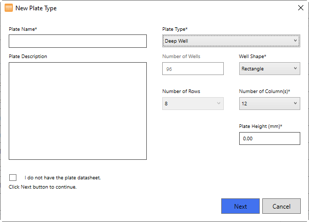 Tick ‘I do not have the plate datasheet’ under the Plate Description box if you don’t know the plate height.