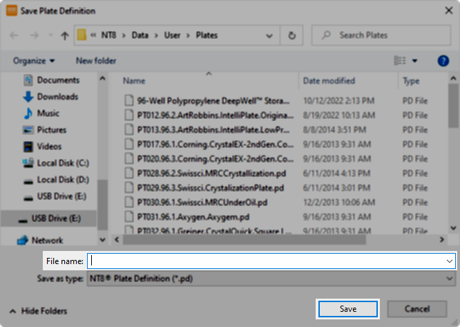 Type a descriptive name for your new plate in the Save Plate Definition dialog box to save it as a .PD file. For easier identification, the file name should be the same as the defined name in the Plate Name field.
