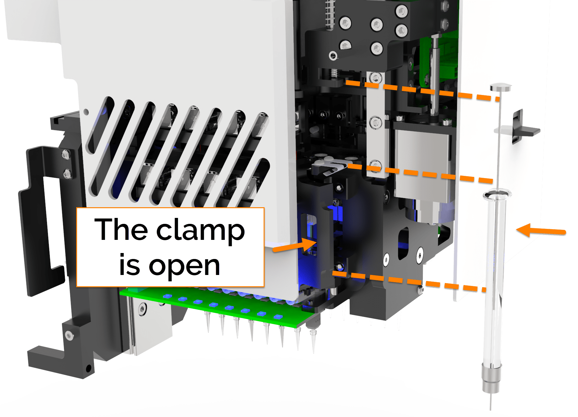 Using your left hand, open the clamp and gently press the syringe barrel into the syringe holder slot. Make sure the barrel is properly attached before releasing the clamp.