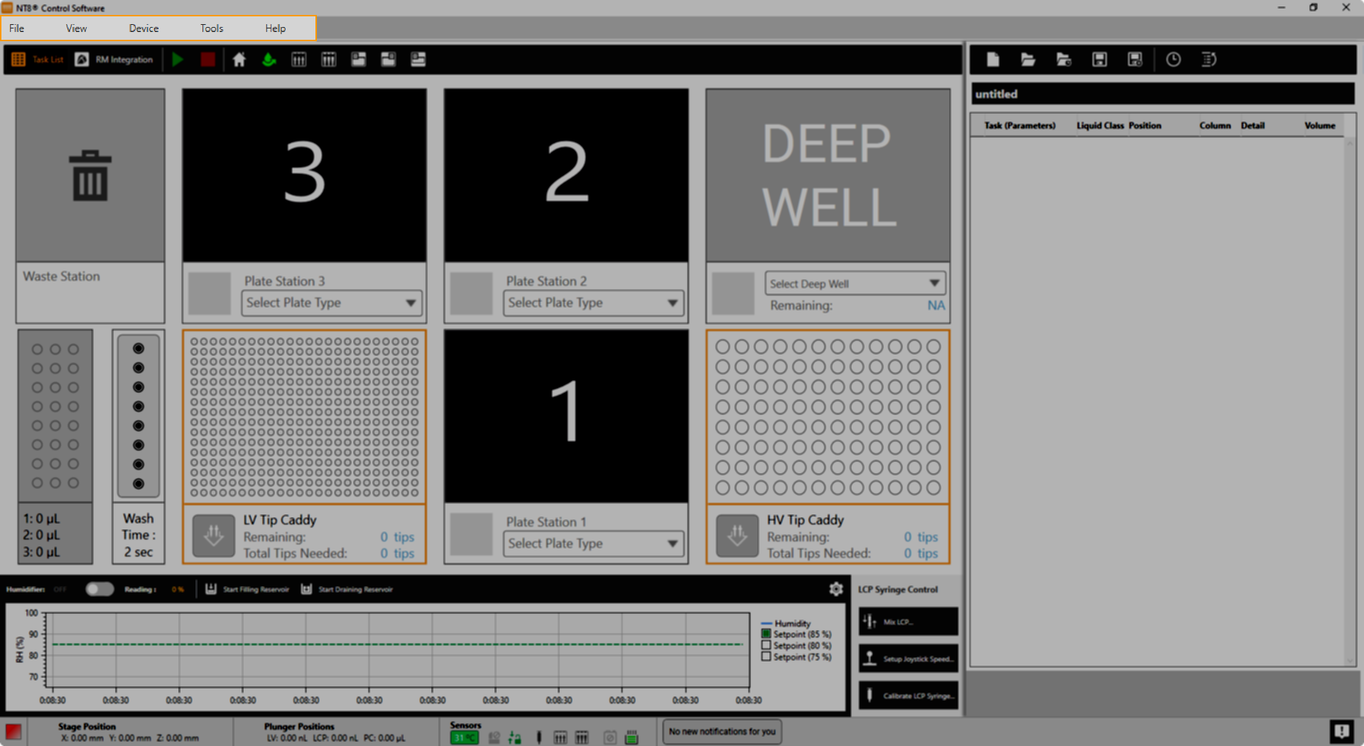 Moves the NT8’s head to the waste station, so that you can load and unload plates and tip caddies and otherwise interact with components on the right side of the stage.