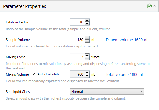 Input the volumes for Dilution Factor, Sample Volume, and Mixing Volume in their respective fields and set the desired number of Mixing Cycle.