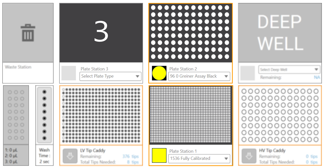 In the Device View, select the plate station for the sample plate and the target plate location(s) along with the corresponding plate type. In the example below, Plate Station 1 and Plate Station 2 are the target and sample plates, respectively.