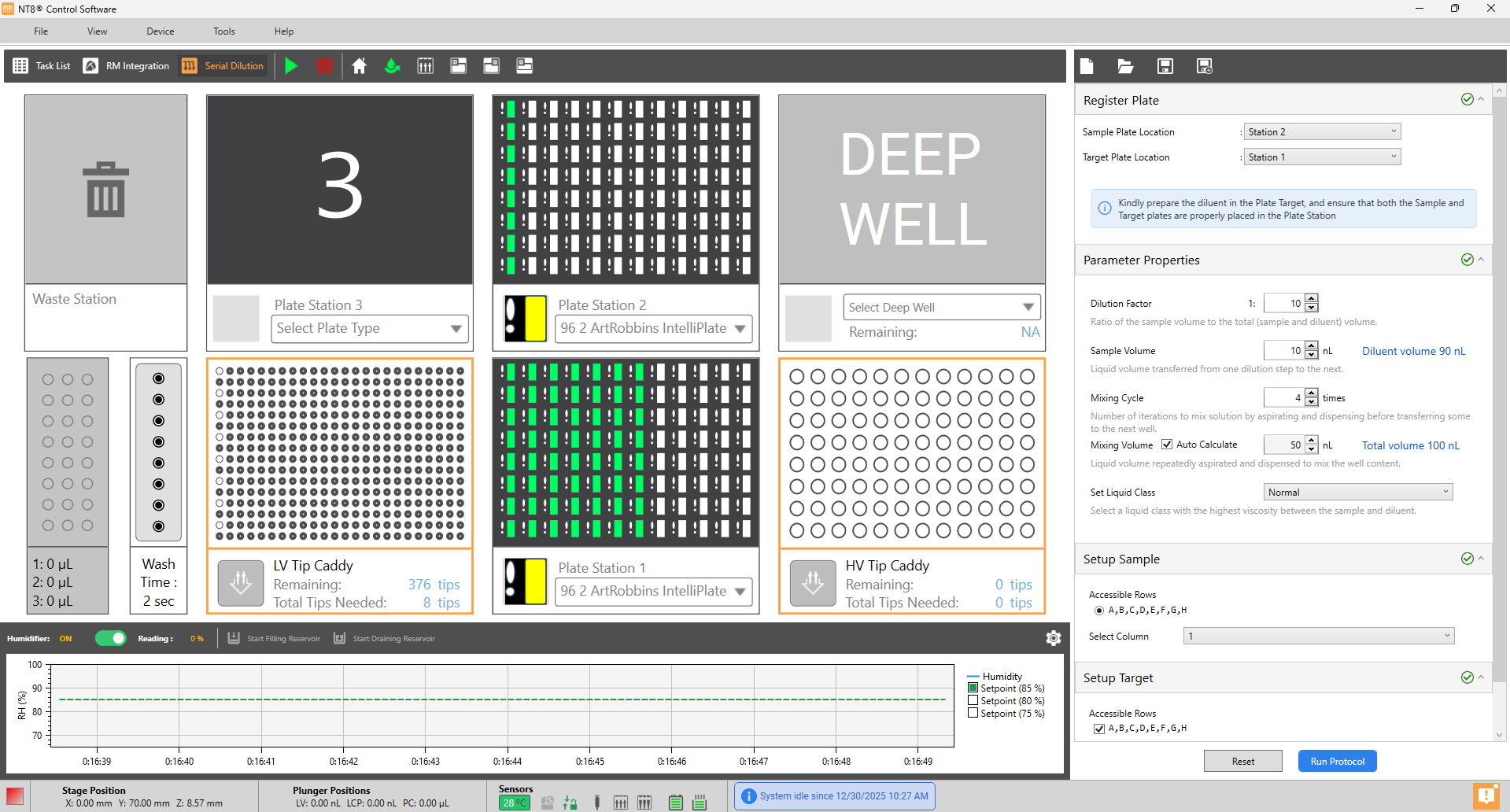 Upon launching the NT8 Control Software, the Task List view is displayed by default. This view lets you manually define the protocol and sequence of dispensing by offering a highly customizable interface. Here is where most of your work will be done, such as designing an experiment, calibrating the reference plate and stations on the NT8 deck, as well as configuring the humidifier settings. If your NT8 is enabled for ROCK MAKER® Integration (RMI), you can switch to the RMI view, using the RM Integration button located next to the Task List view button. In ROCK MAKER Integration view, you can directly import and dispense an experiment as defined in ROCK MAKER.
