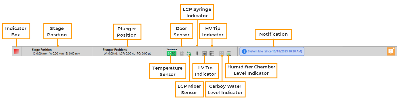 The LCP Mixer Sensor indicates whether or not the LCP mixer plunger is connected to the stage. If connected, the sensor will automatically turn on. If you hover over the mixer sensor icon, it will display “LCP Mixer Locked.” At this point, you are not allowed to perform any experiments until you have disconnected the plunger from the stage. |