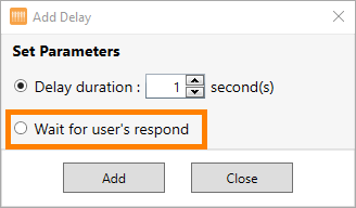 Delay Duration — NT8 pauses at the desired delay time and continues running the experiment automatically. If you select this option, set the delay time in second(s).