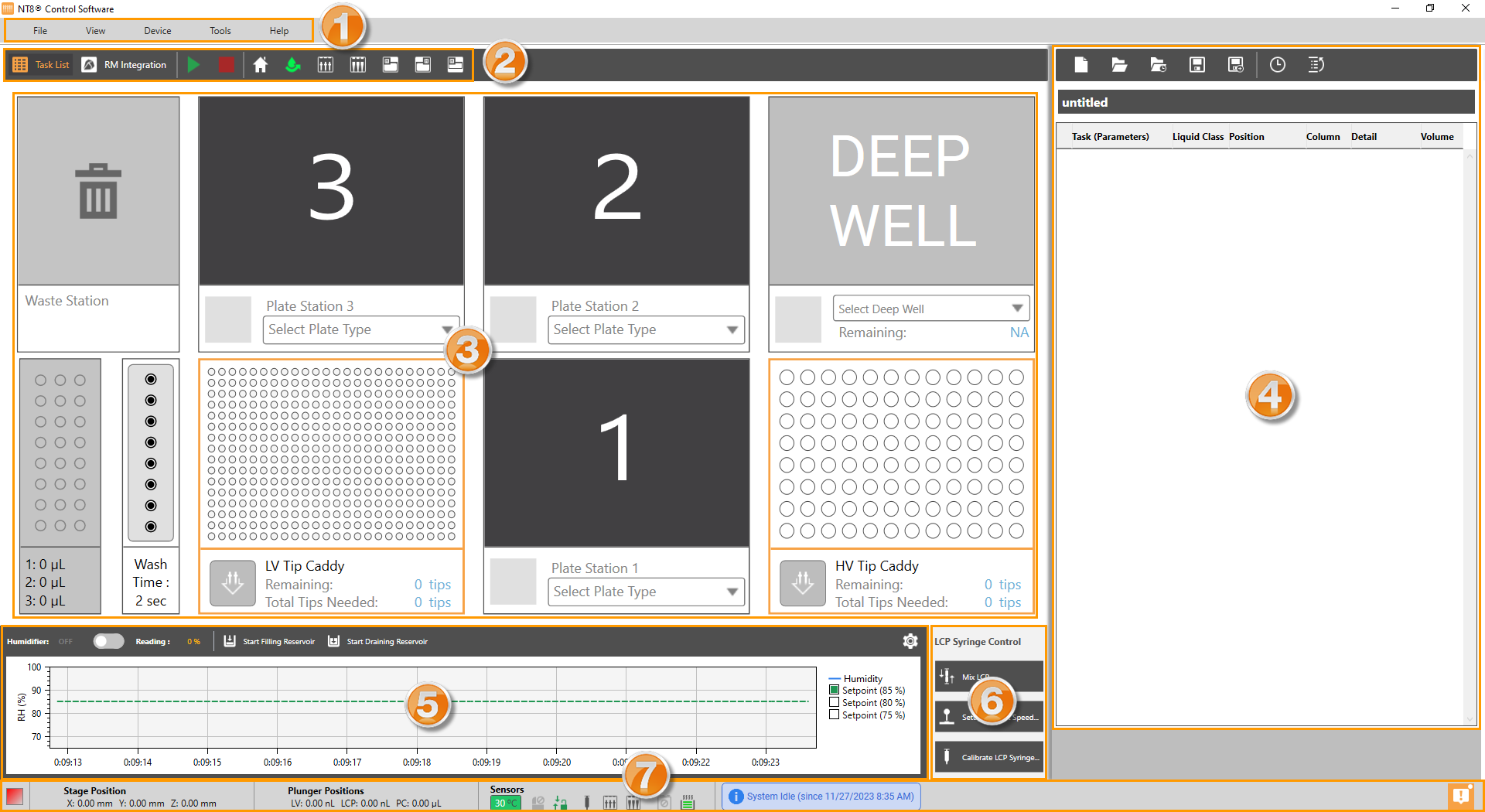 The Task List view is the main screen that is open by default when you first launch the NT8 Control Software. This is the main window in which you interact with the NT8 hardware to set up sitting drop, hanging drop, LCP, seeding, and/or plate copy experiments. The Task List view is divided into several areas as shown below.