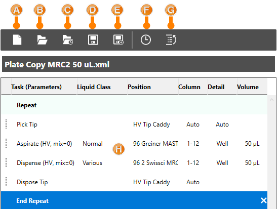 — The Repeat and End Repeat will appear on the task list when you click this button. Any tasks you place between these two commands will be repeated on each selected column of a plate.
