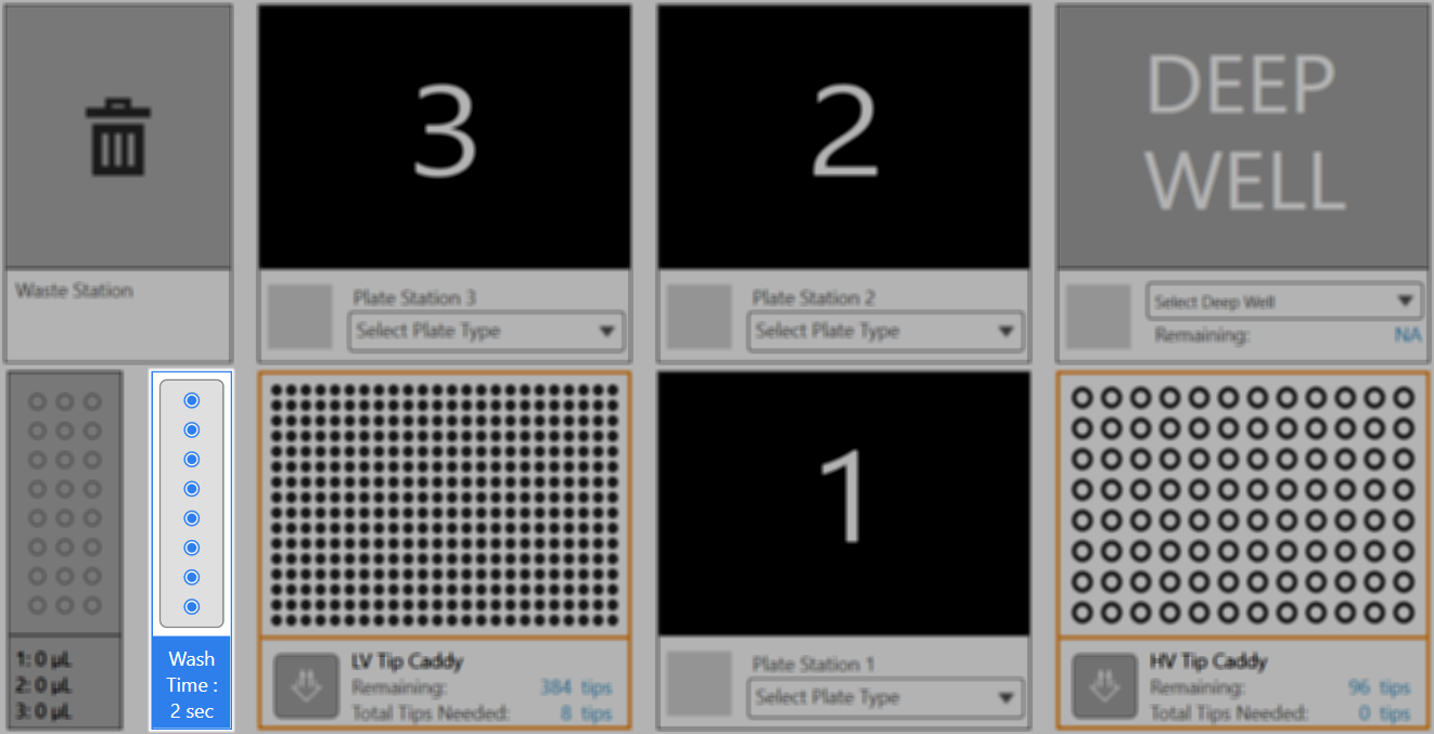 The wash station area is where you add the Wash Tip command and set the Wash Time. These settings are used for any dispense using the LV head. It’s recommended that you add a wash tip command when using the same set of tips for a repeated dispense task to prevent cross-contamination.