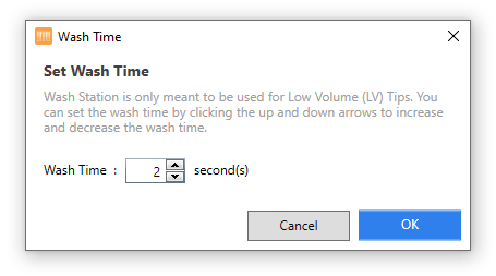 Wash Time: Sets the wash time by typing a new value into the corresponding field, or clicking the up or down arrows to increase or decrease the wash time.