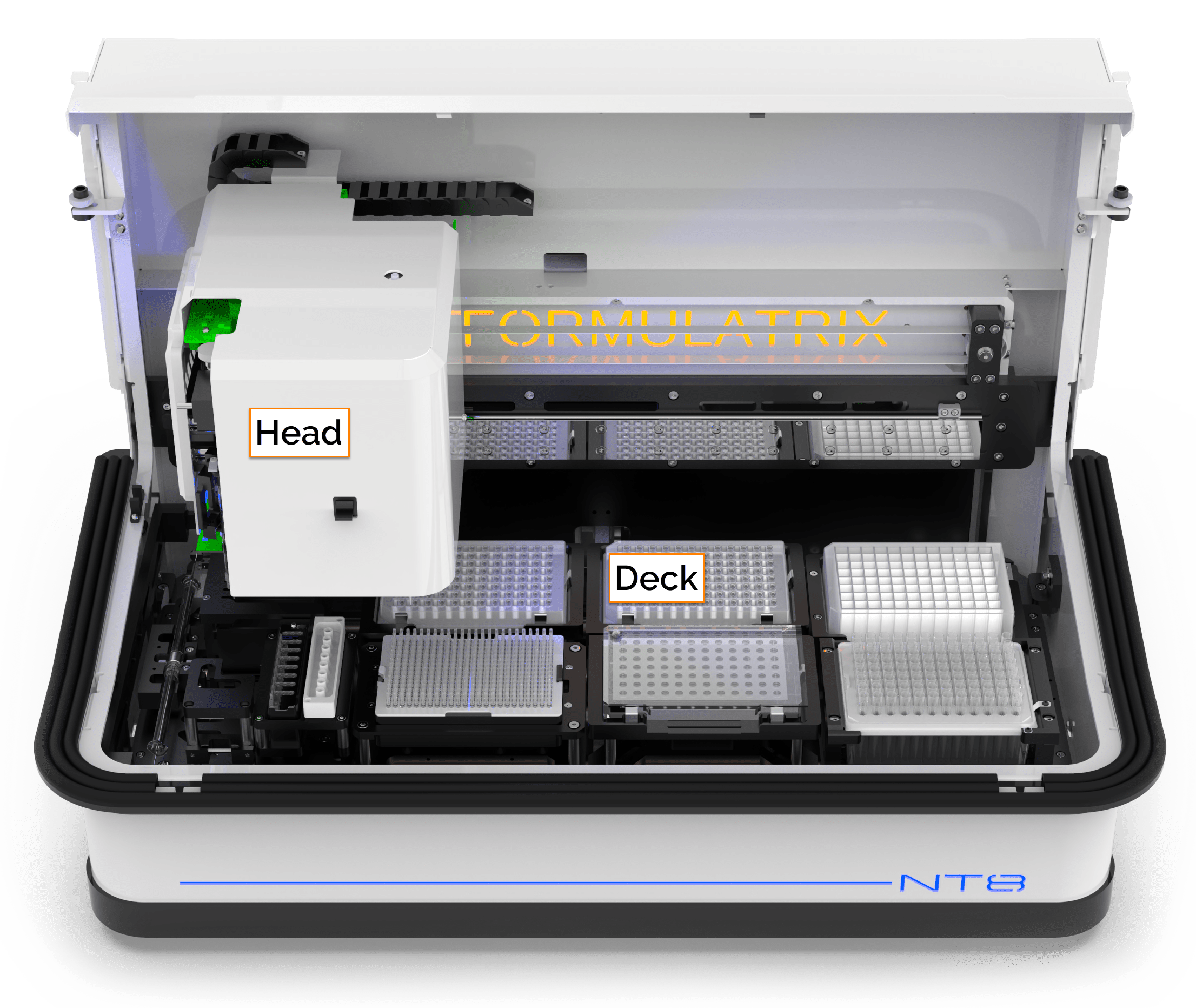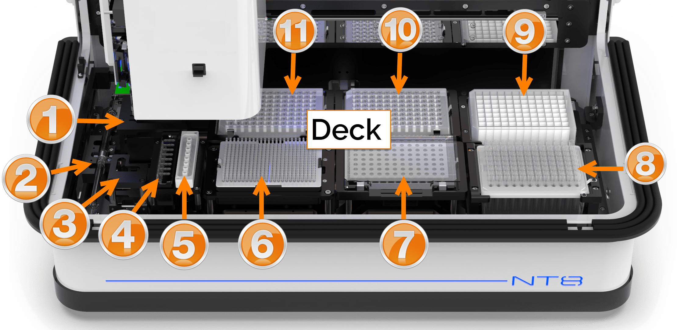 Below, you’ll learn more about each part found on the instrument. The NT8 hardware is comprised of two major components: deck and head. Both are easily accessible at the front of the NT8 instrument.