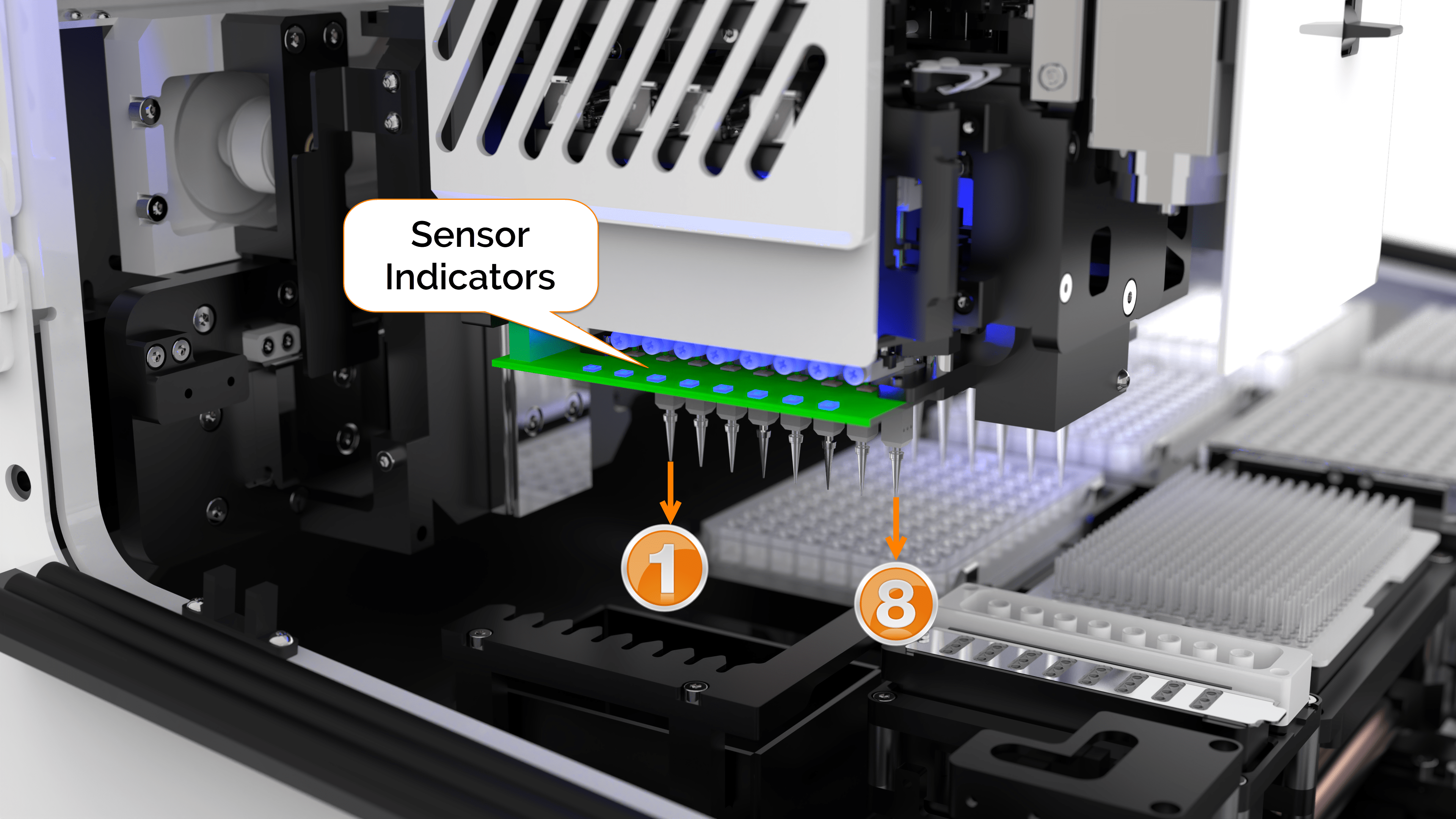 All tips are also equipped with a sensor that indicates when a tip touches the surface, allowing the NT8 to drive down the surface of plate carefully. The tips will retract slightly away from the surface, allowing for a perfect dispense gap to set drops. This way, bubbles are eliminated and drop precision is improved.