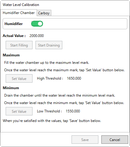 Are you tired of navigating back and forth between Water Level Calibration and the Humidifier control window just to tune the water level? Now do it all in one place with the new Humidifier button in the Water Level Calibration window.