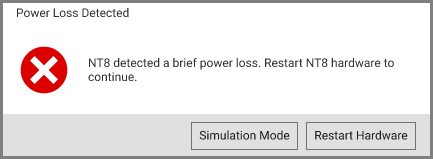 If the system detects a power loss issue with your hardware, it will notify you immediately and provide options for resolution. You can choose to restart your hardware or switch to simulation mode, preventing you from time-consuming manual hardware restarting.