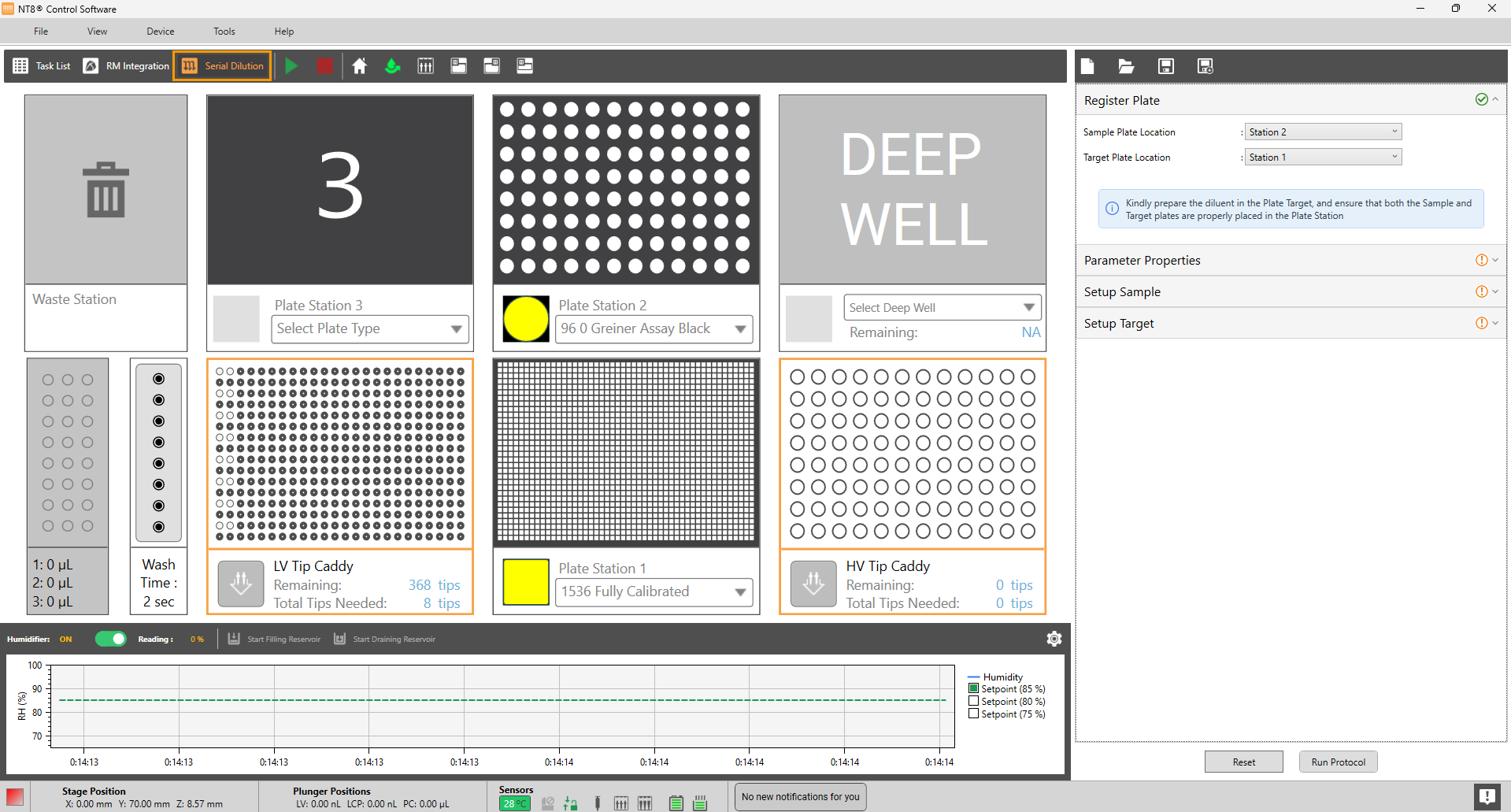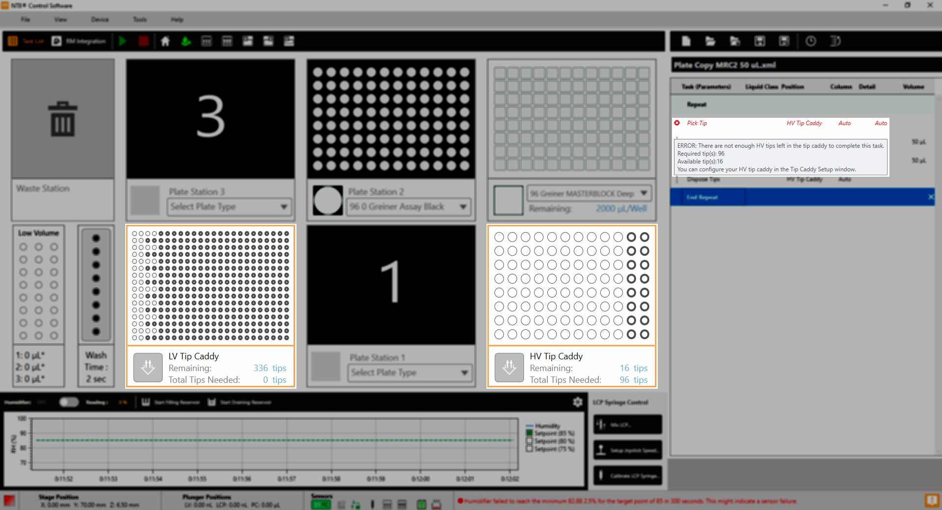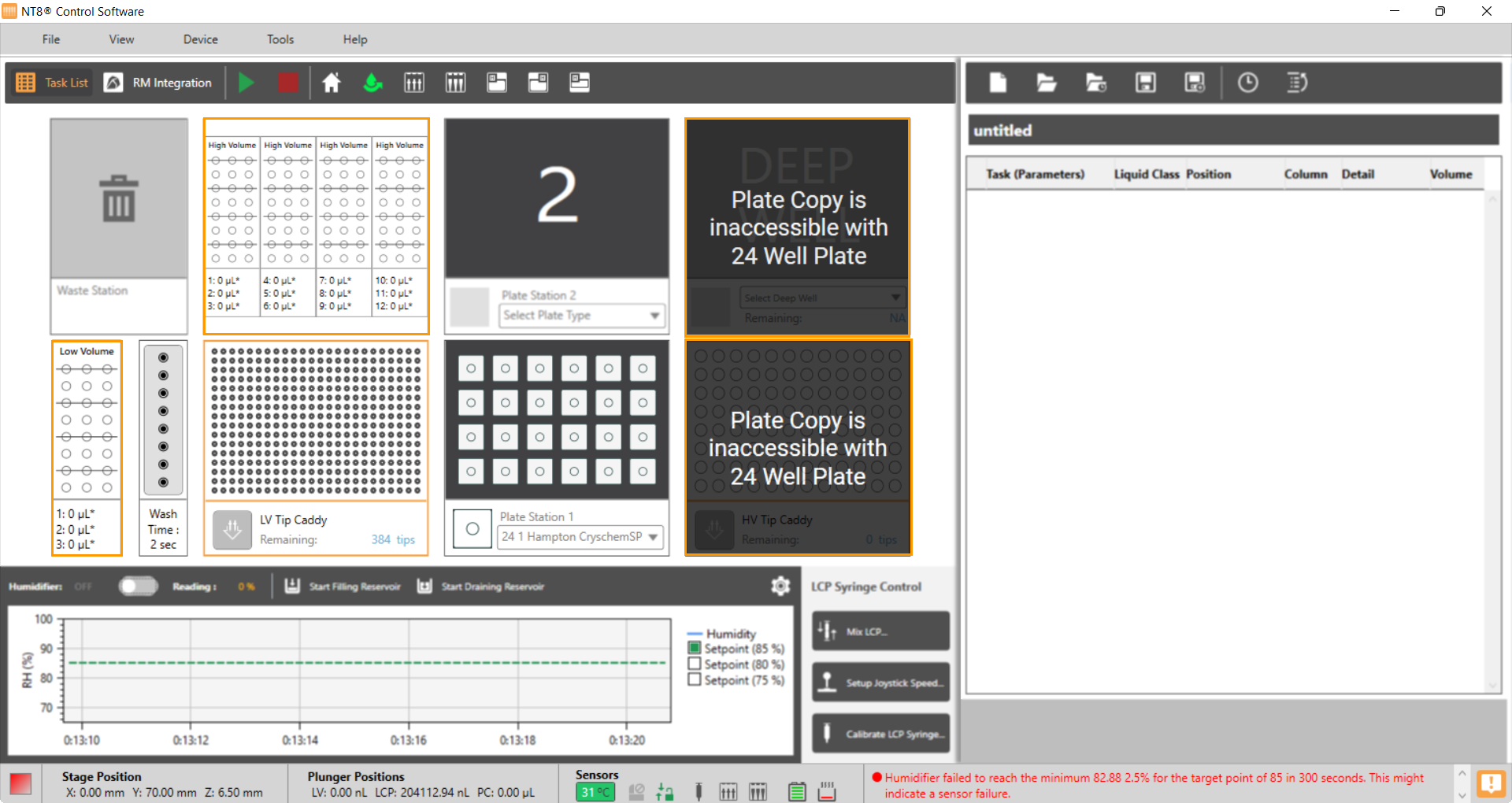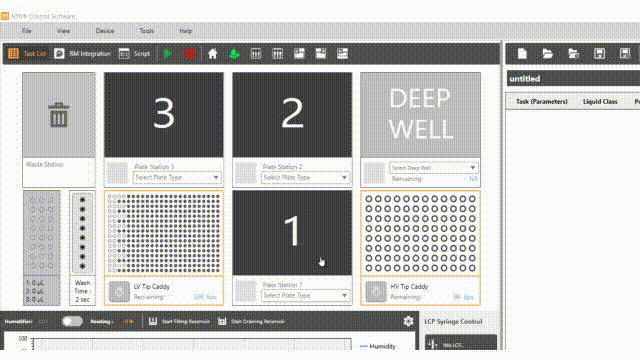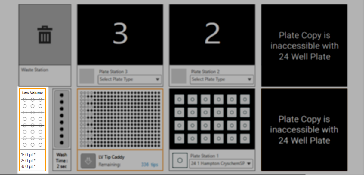 The software interface improvement also goes for the Deep Well and HV Tip Caddy Stations interface. The Deep Well and High Volume Tip Caddy stations you use to run the Plate Copy option are highlighted as “Unavailable” when using 24-well plate dispensing. This improvement aims to keep your NT8 hardware safe. A message informing you that both stations are not accessible is provided in each station to give you a visual cue that the Plate Copy option will not be available for 24-well plate dispensing.