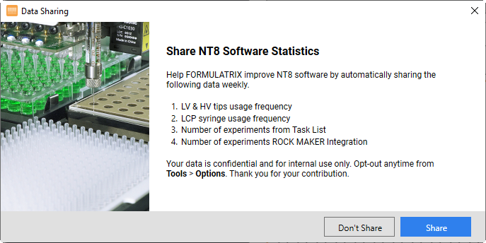 The Data Sharing option is a new feature to enhance NT8 software with your collaboration and make your experience better. When you activate it, the system will send the following specific data with us weekly: - LV and HV tips usage - Dispenses using LCP syringe - Experiments run from Task List - Experiments run from RM Integration, including barcodes