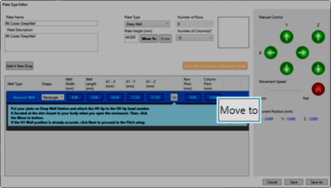 The Plate Type Editor window now includes a Move To button while performing a Deep Well plate calibration. It helps you move the head to the Deep Well station when you need to validate the current calibration. Previously, the button was unavailable, preventing you from verifying the Deep Well plate calibration.
