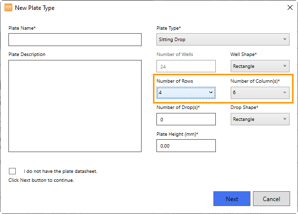 The New Plate Type wizard has also been optimized so you can modify the Number of Rows and Number of Columns in order to create a new plate definition for a 24-well plate type. To find out more, go to Adding and Editing Plate Types.