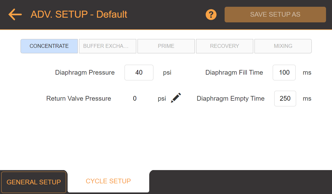 Click the CYCLE SETUP tab to adjust the Diaphragm Pressure, Return Valve Pressure, and fill/empty time.