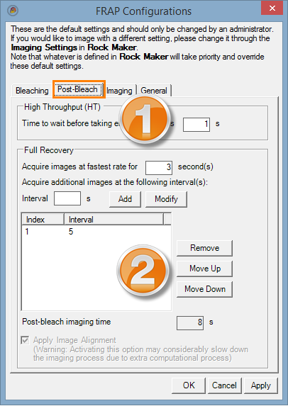 The FRAP Post-Bleach options are available on the FRAP Benchtop ROCK IMAGER or ROCK IMAGER 1000 with a FRAP imaging method option. To support your imaging performance, FRAP Configuration provides some optional settings such as High Throughput (HT) and Full Recovery. To configure these settings, on the File menu, click FRAP Configurations, and click Post-Bleach.