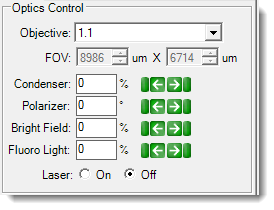 Optics Controls allow you to manipulate the microscope's optics while manually inspecting a plate. The optics controls appear on the left-hand of the Live Image Sub-Tab of the Imager Tab, and vary based on the imaging methods you purchased.