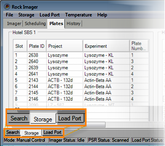 Hotel data is displayed in tables on the two tabs of the Plates tab (Load Port, and if you have ROCK IMAGER 1000 or 182, Storage). These tables provide at-a-glance plate information and allow you to perform various actions on the plate(s) through right-click options or the menu bar at the top of the screen.
