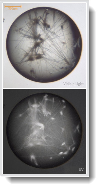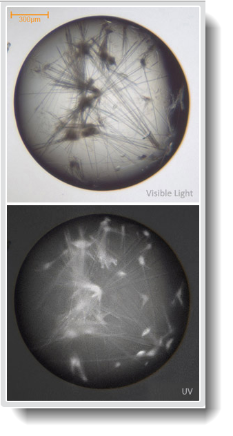 FORMULATRIX's ultraviolet (UV) imaging technology uses the fluorescence of tryptophan under UV light help you distinguish between protein and salt crystals and reveal crystals that may not be located with visible light. Our UV solution uses 100% UV-optimized components, including UV-grade optics, a UV-sensitive camera, and UV lighting.