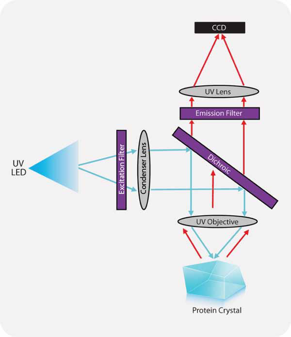 The excitation light is projected onto the protein crystal via the condenser lens - dichroic - UV objective optical chain. (Blue arrow)