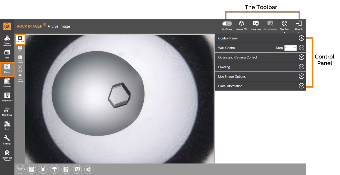 Views the content of a plate in real time, which is useful when conducting manual inspections. Important: The longer you keep a single drop under a live image, the more you expose your sample to heat. We highly recommend that you turn the Live Stream OFF when not actively inspecting wells. |