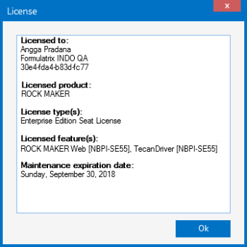| Maintenance expiration date | Tells you the expiry date of your maintenance coverage for ROCK MAKER. | The day and the date, e.g. Sunday, September 30, 2018 |