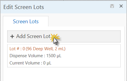 - Type in the dispense and current volumes for the screen lot in the appropriate boxes. Then, click the Add button.