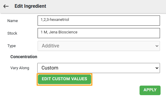 Custom: you can design each well’s volume or concentration using the Edit Custom Values dialog box accessible through the EDIT CUSTOM VALUES button. Go to Creating a Grid Layer.