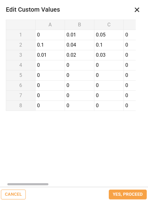 The rows and columns in the Edit Custom Values dialog box correspond to the wells in the plate, and the measurement unit in the dialog box follows the measurement of your ingredients. You can fill in the Edit Custom Values dialog box accordingly.